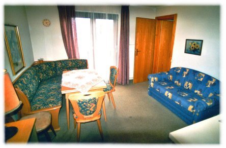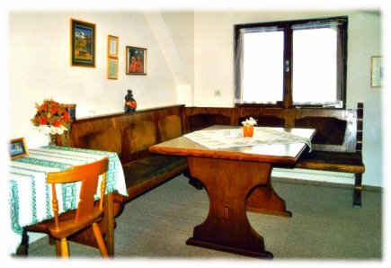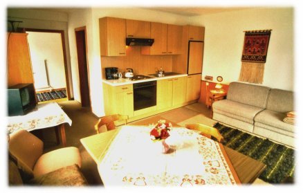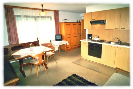 Zwei Zimmer Ferienwohnung mit Schlafzimmer und Wohnküche. Die Wohnung hat ein Badezimmer mit Bad/Dusche und im Schlafzimmer noch eine extra Dusche. Das Wohnzimmer hat einen Südbalkon mit sehr schöner Aussicht, das Schlafzimmer ist nordseitig gelegen. In der Wohnküche befindet sich eine Eckbank mit Tisch und Stühlen, ein Ausziehsofa, ein Ferseher und ein Telefon. Die Kochecke hat einen Herd mit 4 (2) Platten und (Backrohr), einen Kühlschrank, ein Spülbecken und eine Kaffeemaschine. |